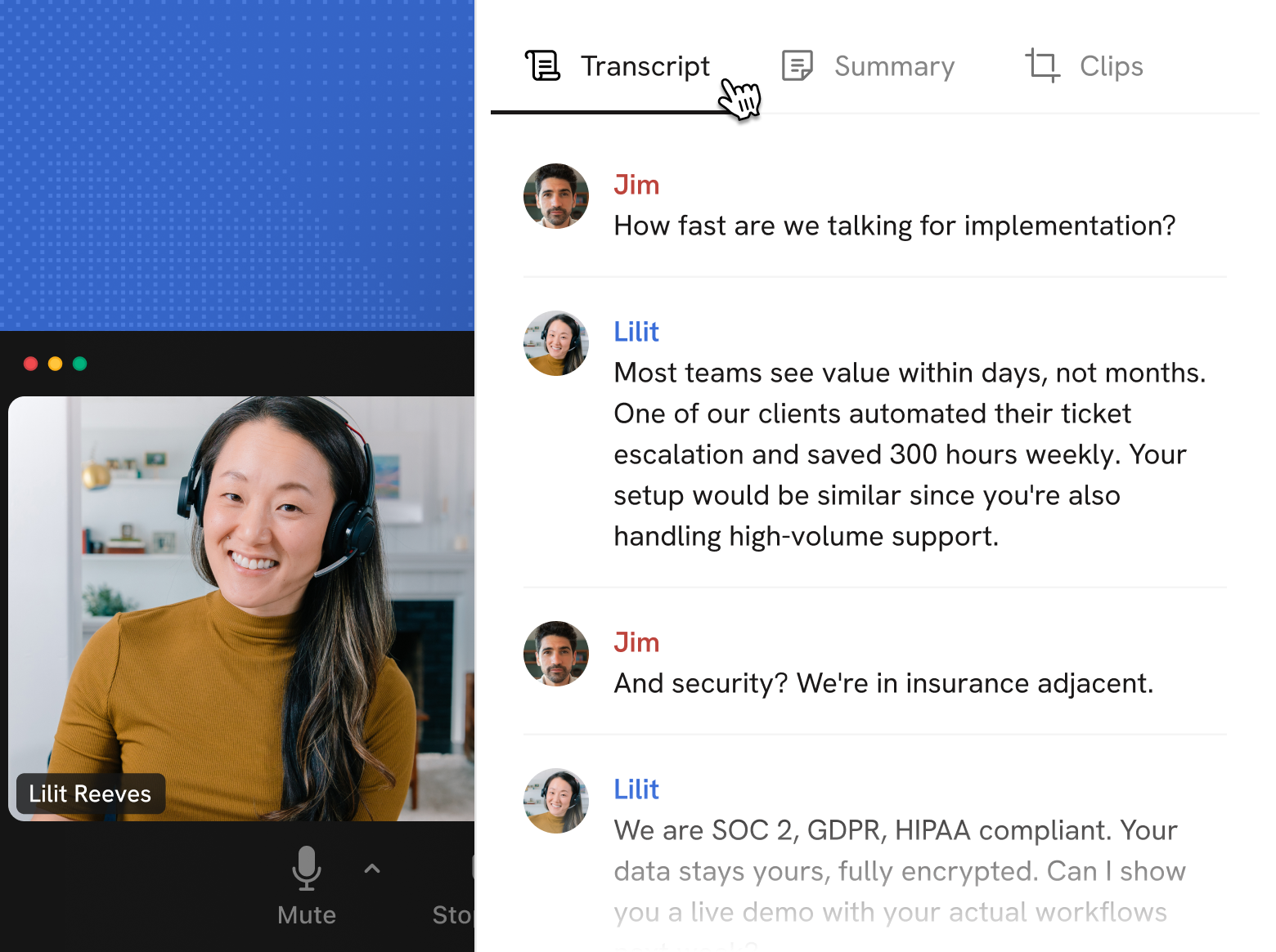 No. Your meeting recordings, transcripts, and summaries are never used to train AI models. Data is used solely to power your Agents and Workflows, and is encrypted in transit and at rest.