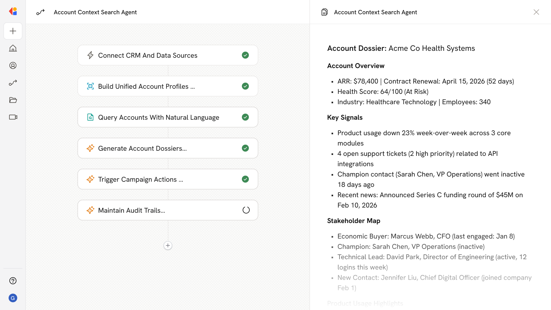 Teams query account context in plain language and receive cited dossiers with firmographics, intent signals, usage trends, and stakeholder maps—grounded in your actual data, not hallucinations.