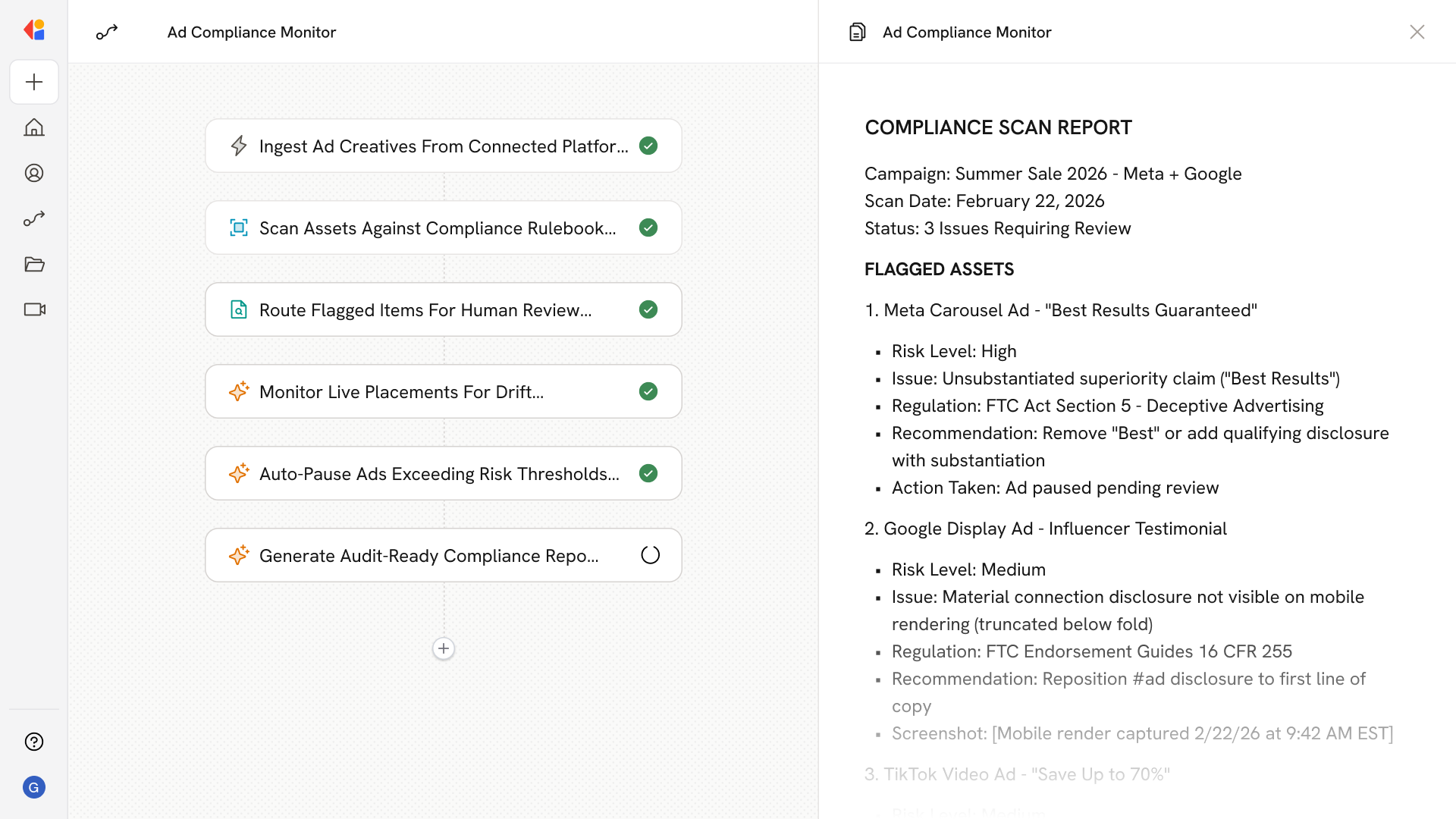 The agent scans every creative for high-risk claims, disclosure adequacy, and substantiation gaps—flagging problems and routing exceptions for human review before ads go live.