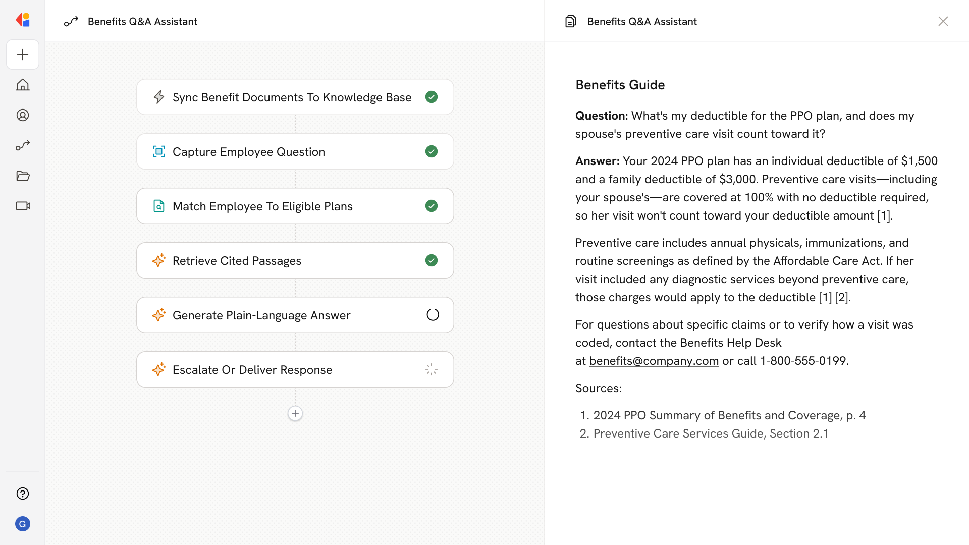 For ambiguous questions, PHI-linked inquiries, or medical necessity determinations, the Workflow escalates to your benefits team with full transcript and citations. Routine answers are delivered instantly—with audit logs capturing every interaction for HIPAA compliance.
