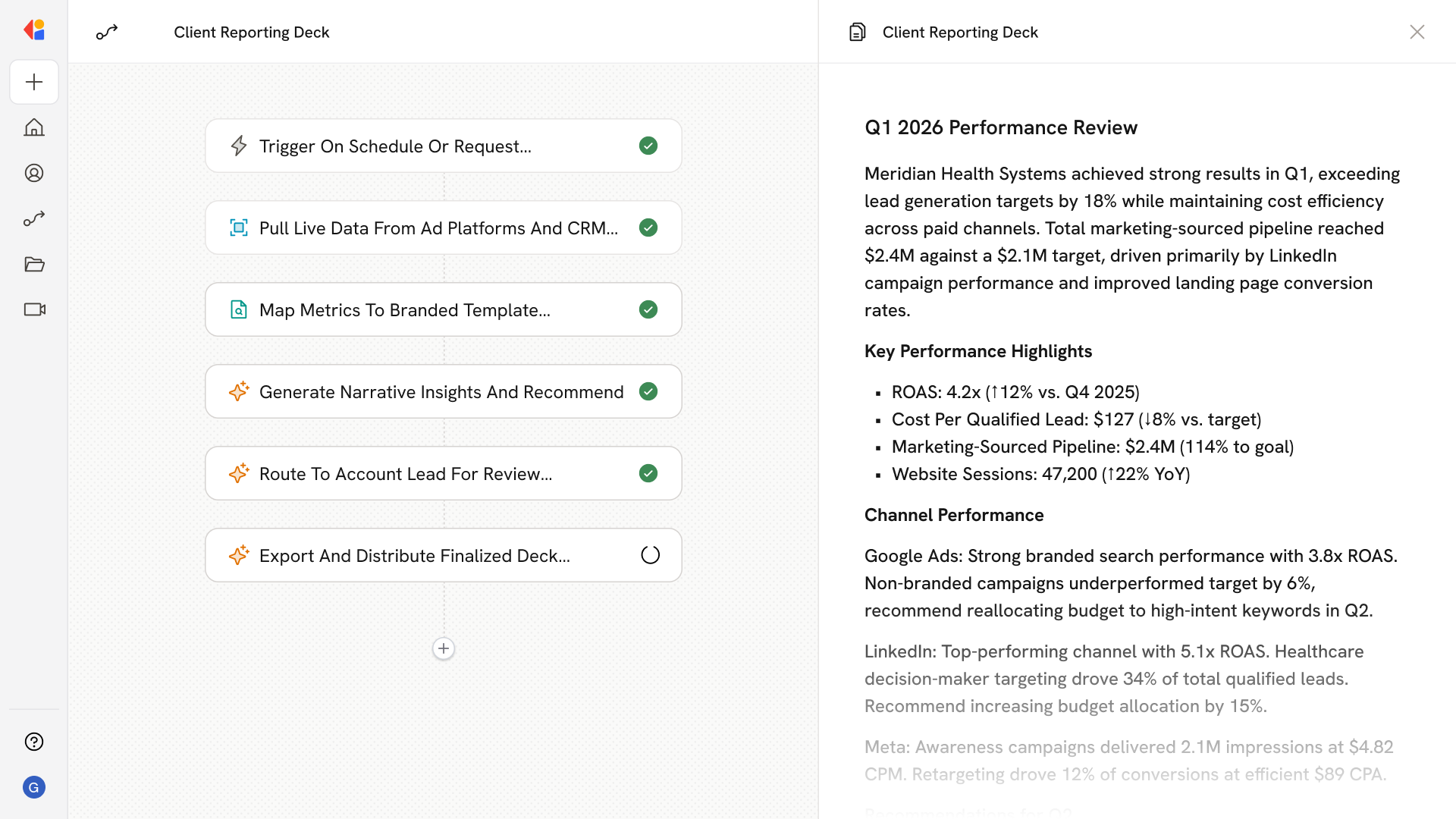 The draft deck routes to the account lead or strategist for final review, allowing edits to commentary and spot-checks on data accuracy before sign-off.