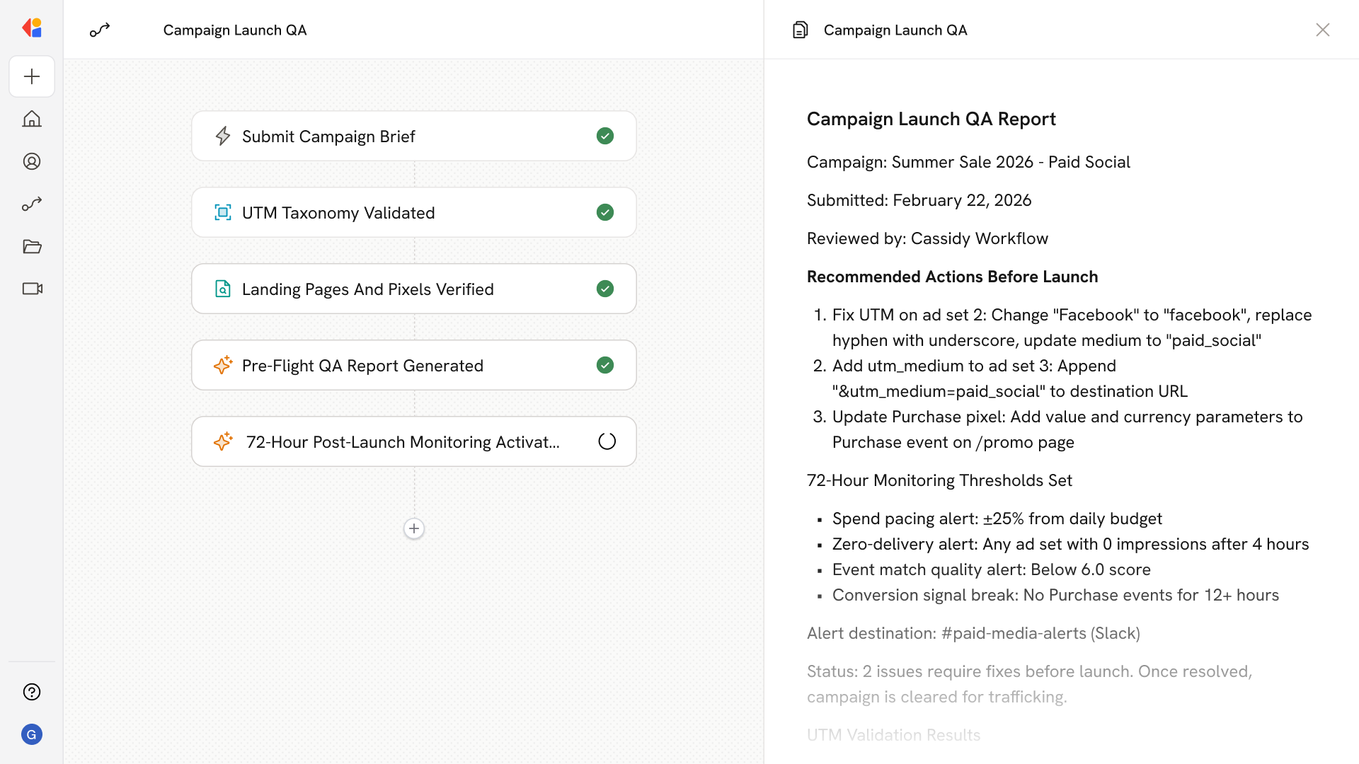 Cassidy compiles validation results into a structured QA report—documenting passed checks, flagged issues, and recommended fixes—then routes it to the appropriate team member for review before launch.