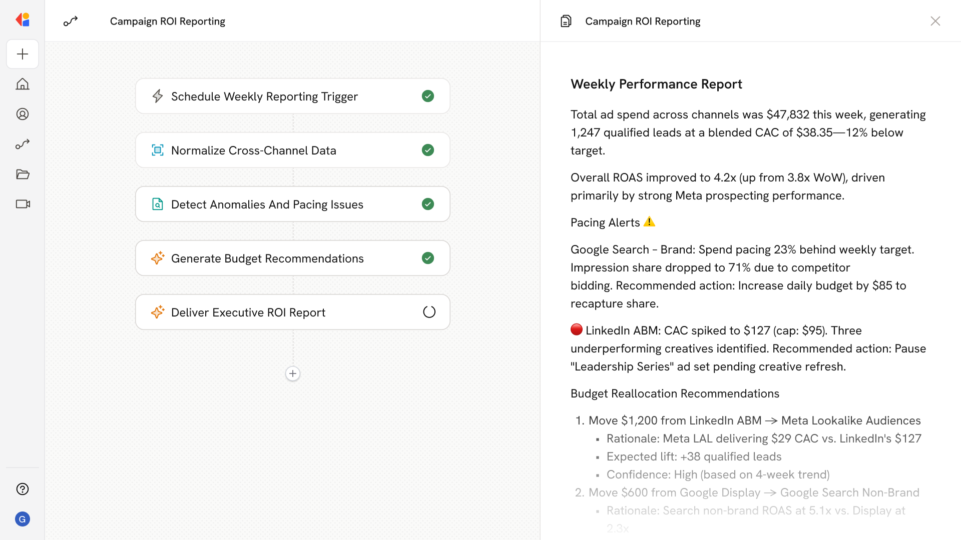 The agent connects to Google Ads, Meta, LinkedIn, TikTok, Amazon Ads, and your CRM to normalize spend, conversions, and revenue into a single source of truth—eliminating spreadsheet sprawl and reconciliation headaches.