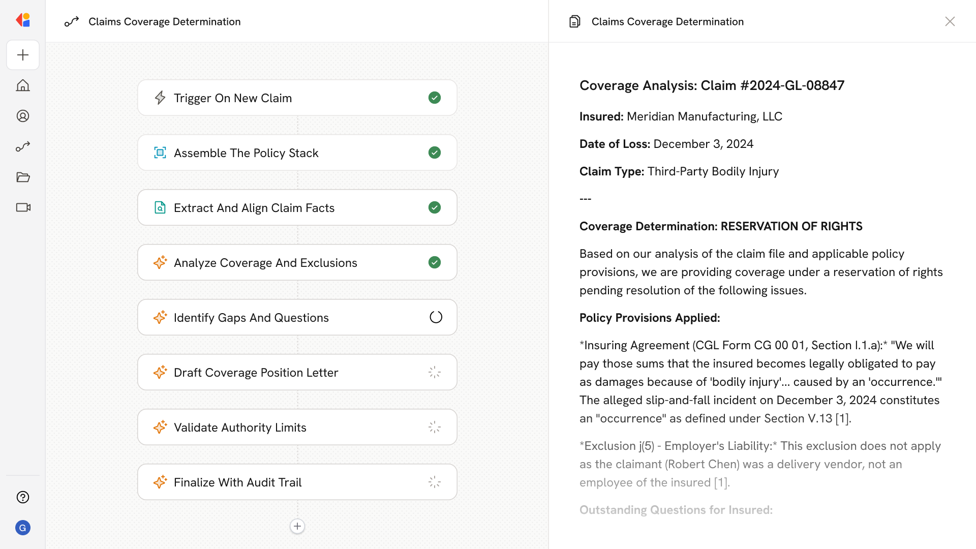 Automated extraction aligns claim facts and allegations to coverage triggers, identifies factual gaps, and generates targeted questions grounded in policy language.
