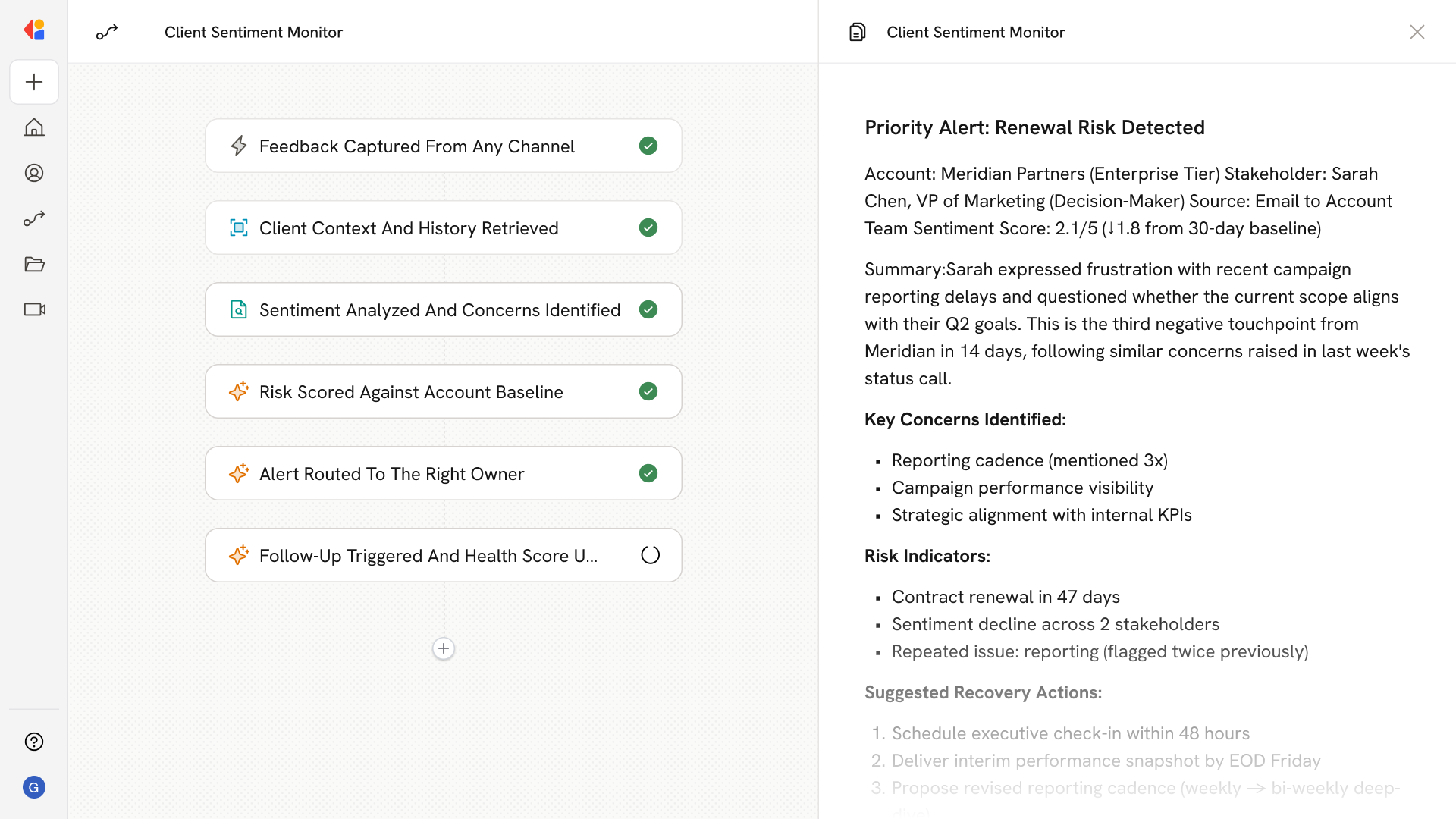 The Agent applies aspect-based sentiment analysis to identify specific concerns (e.g., reporting cadence, creative quality, media performance), detects emotion and intent, and flags whether the feedback represents a potential escalation, renewal risk, or service request.