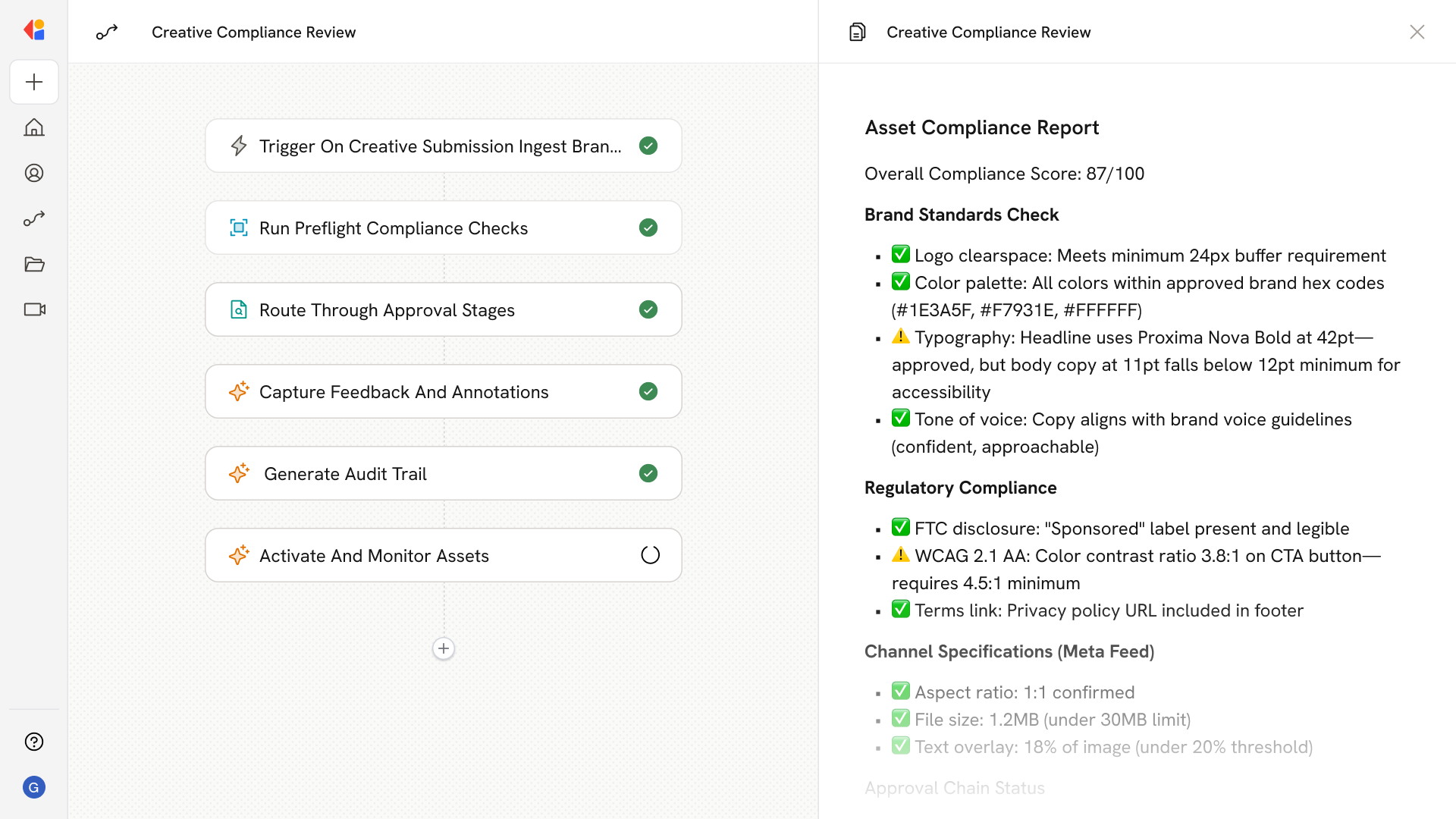 The Agent validates the asset against brand standards (logo clearspace, color palette, tone of voice), regulatory requirements (FTC disclosures, WCAG accessibility), and channel specs (aspect ratios, character limits), generating a compliance score and flagging deviations.