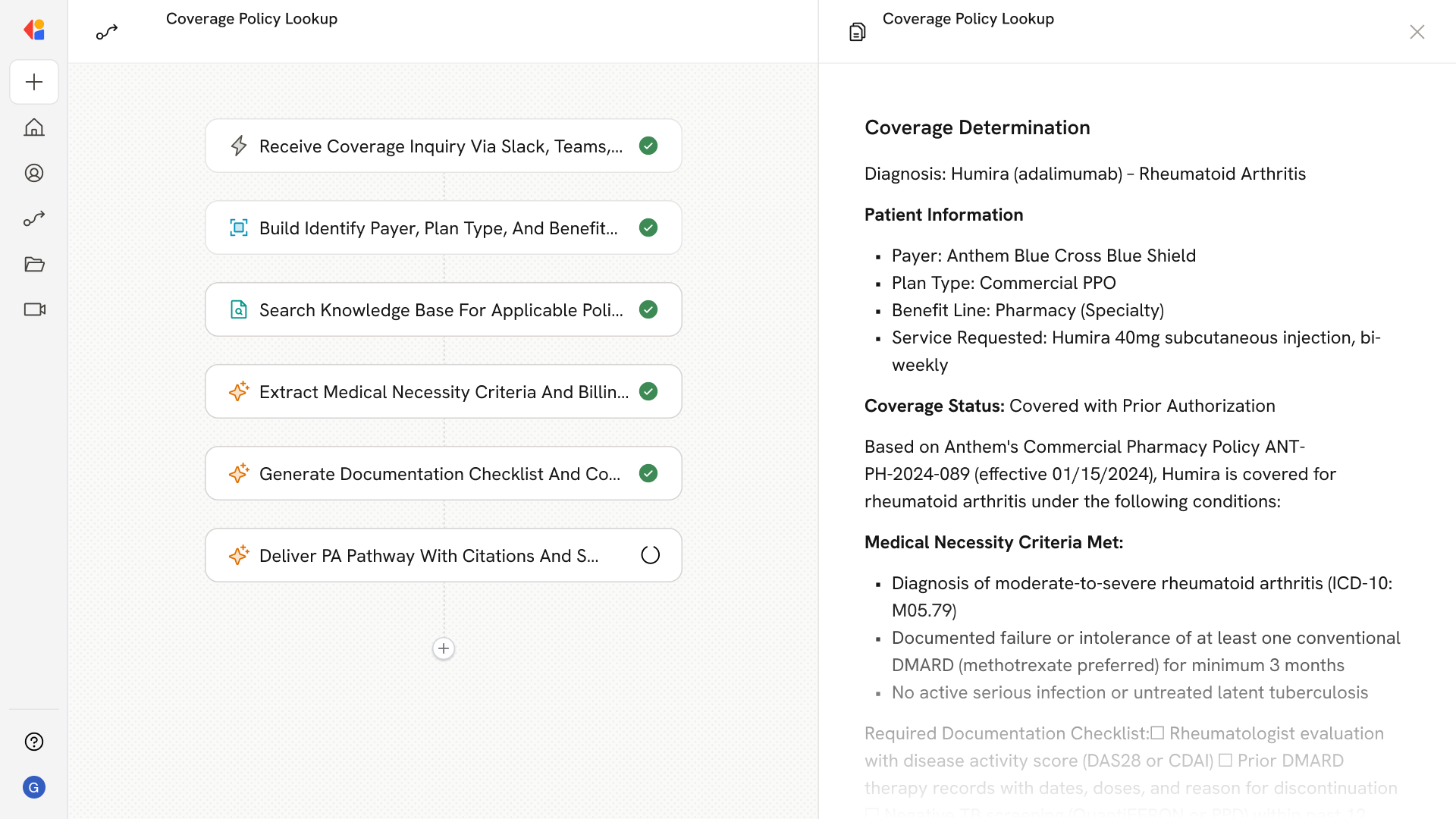 The system generates patient-specific checklists aligned with policy verbiage—capturing prior treatment history, lab results, clinical scores, and specialist involvement—so submissions meet medical necessity standards on the first attempt.