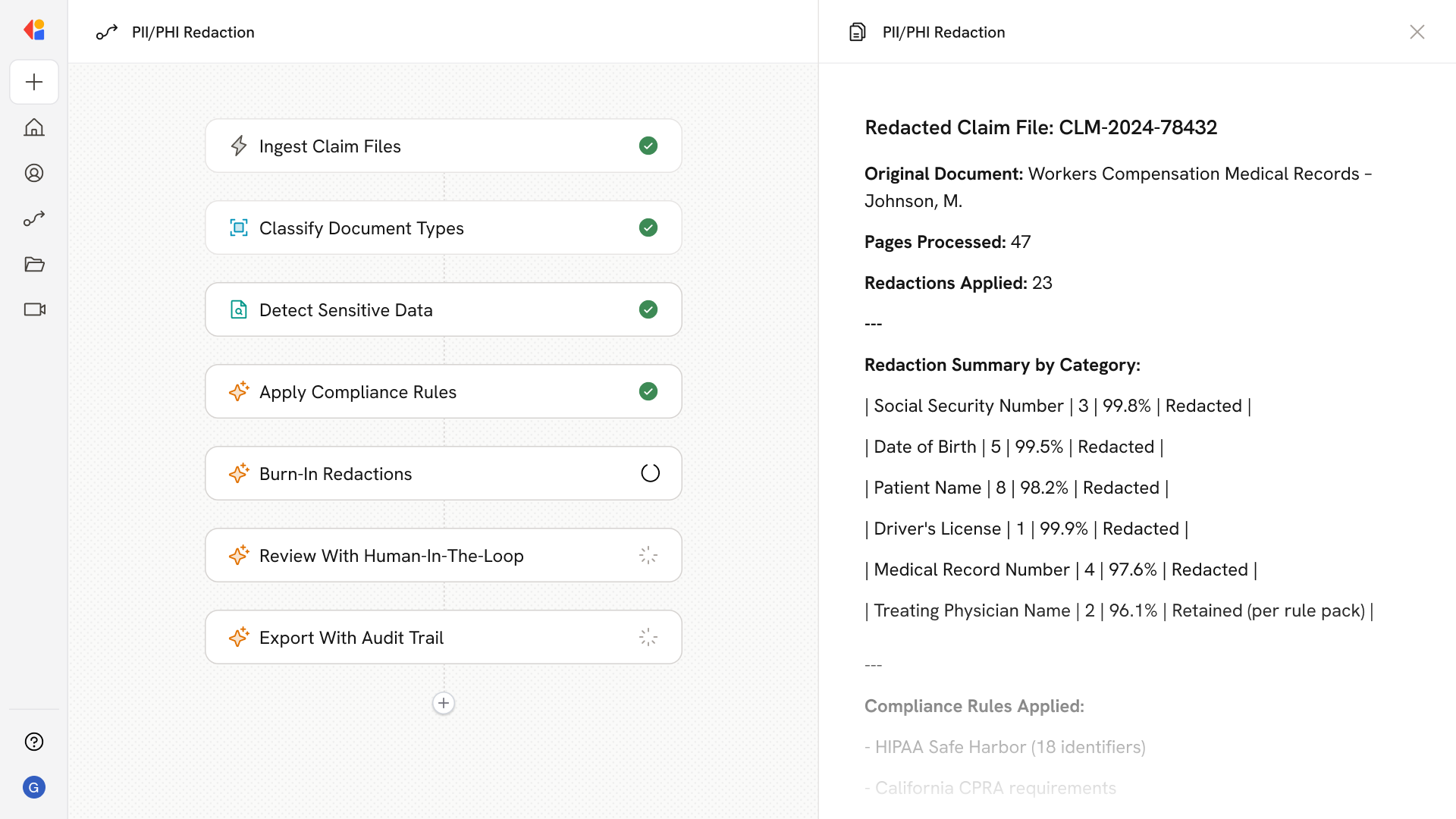 Hybrid rules and NLP identify SSNs, DOBs, clinical entities, and sensitive identifiers across medical records, adjuster notes, police reports, and mixedmat claim files.