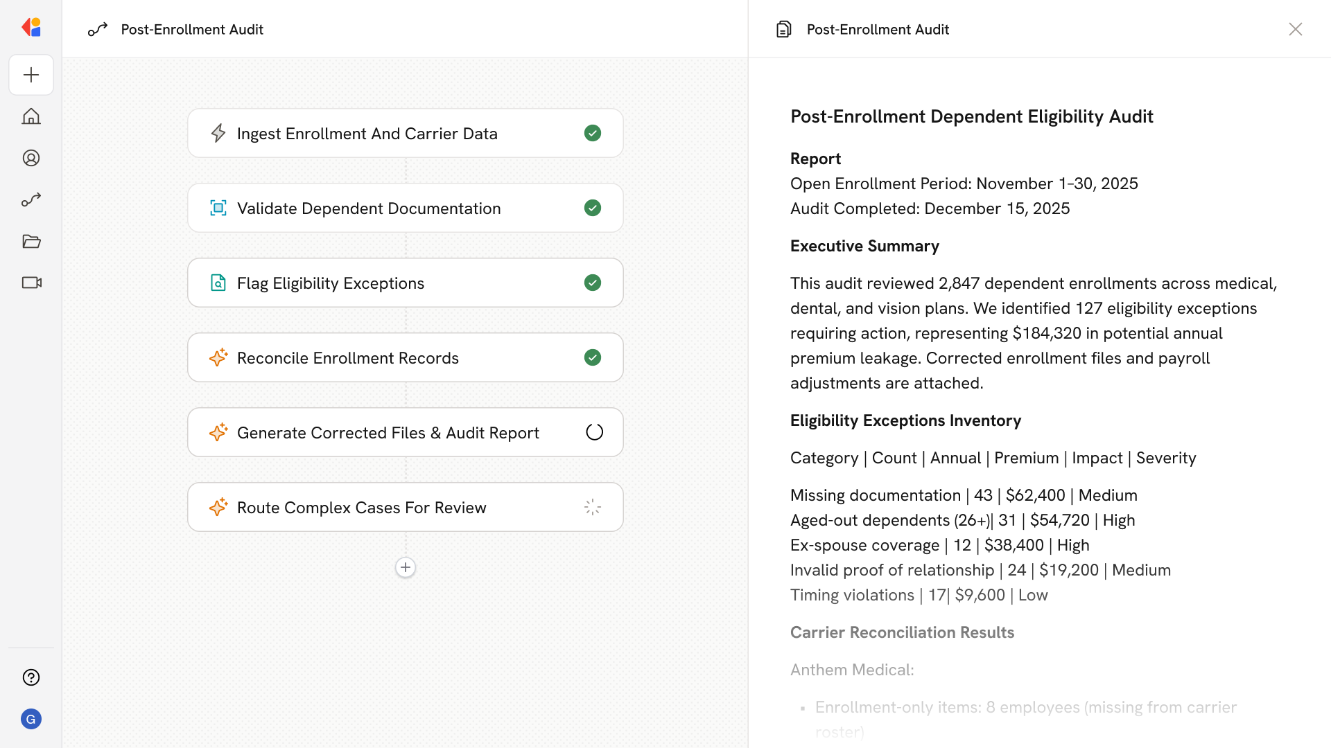 The Workflow produces updated EDI 834 enrollment feeds, payroll adjustment summaries, COBRA notifications for disenrolled dependents, and a comprehensive audit report showing ineligible dependent rates, premium leakage avoided, and remediation actions.