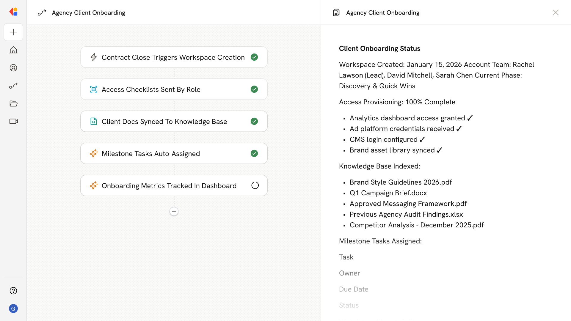 The Workflow activates when a deal closes in your CRM, automatically creating an onboarding workspace and populating role-based task templates for account, creative, media, and analytics teams.