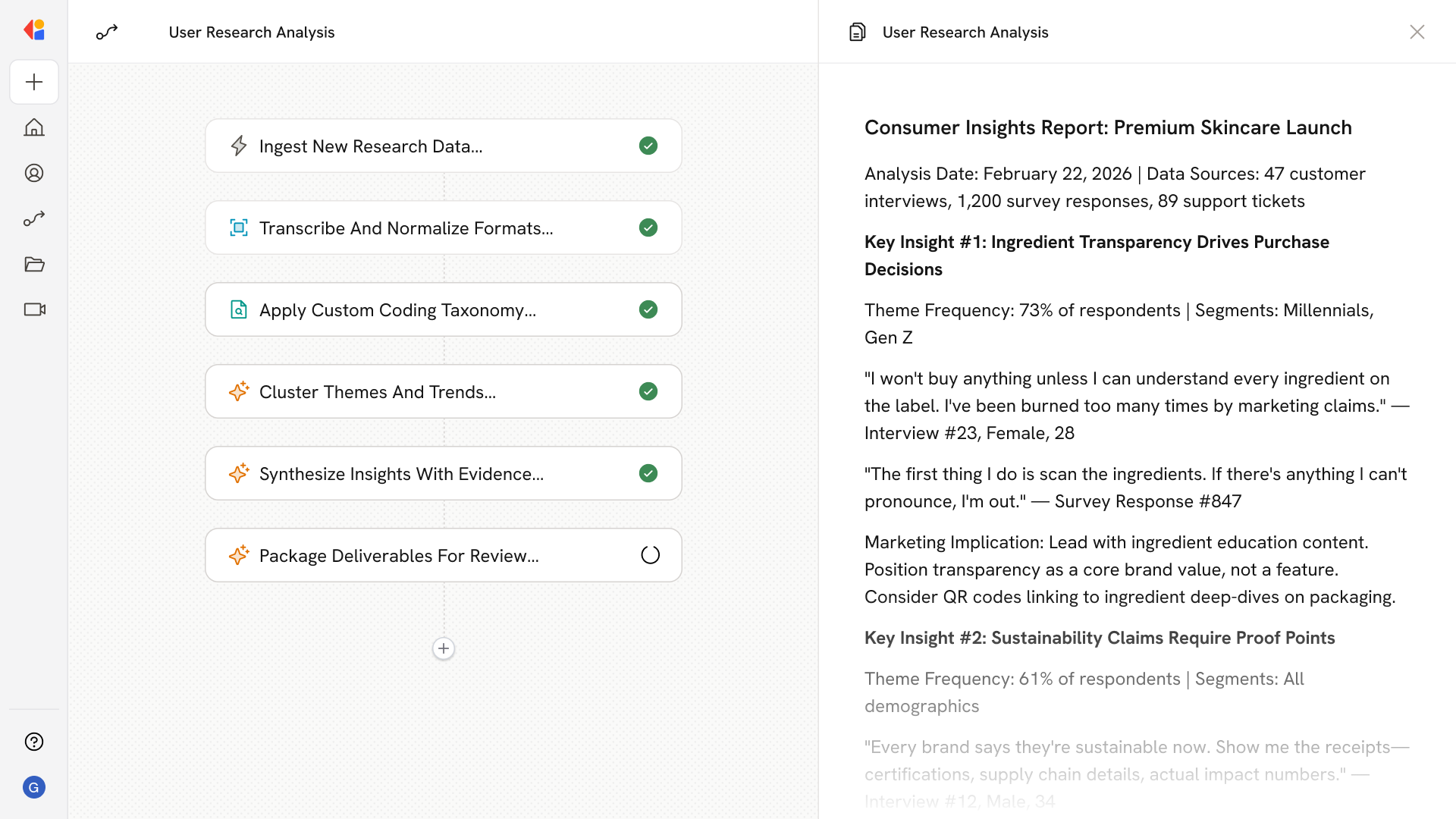The system synthesizes coded insights into personas, JTBD frameworks, messaging matrices, and creative briefs—each linked to timestamped quotes and source artifacts for stakeholder trust.
