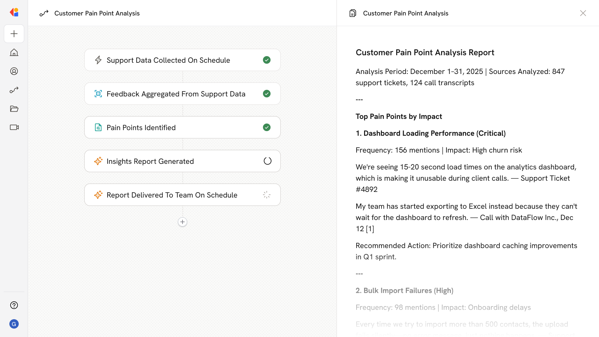 The Workflow activates on a scheduled basis or when new support tickets and meeting transcripts are added—pulling from sources like Zendesk, Gong, or your helpdesk.