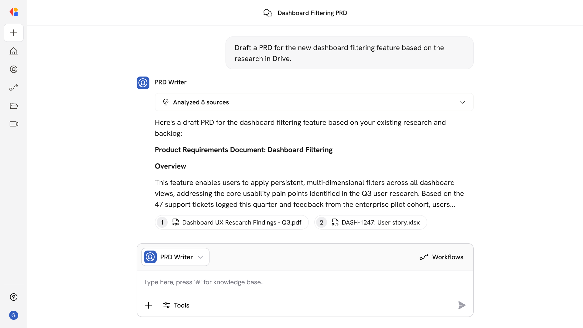 PRD Writer handles the heavy lifting of structuring and grounding product specs. Ask questions like: